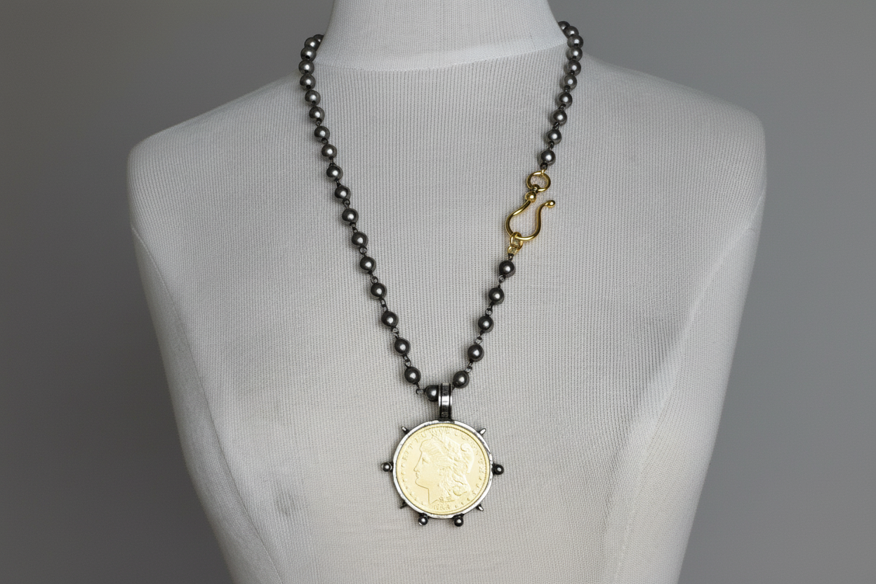 Elegant Black Pearl and Gold Liberty Coin Necklace with Oversized Clasp